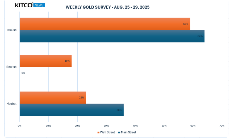 در همین حال، ۱۹۴ رأی در نظرسنجی آنلاین کیتکو ثبت شد که سرمایهگذاران اصلی نیز از خوشبینی اخیر خود عقبنشینی کردند، در حالی که همچنان به چشمانداز طلا کاملاً خوشبین بودند. در مجموع ۱۱۵ معاملهگر خرد، یا ۵۹٪، انتظار داشتند قیمت طلا هفته آینده افزایش یابد، در حالی که ۳۵ نفر دیگر، یا ۱۸٪، انتظار داشتند که فلز زرد با قیمت پایینتری معامله شود. ۴۴ سرمایهگذار باقیمانده، که ۲۳٪ از کل را تشکیل میدهند، روند طلا را در کوتاهمدت خنثی پیشبینی کردند.