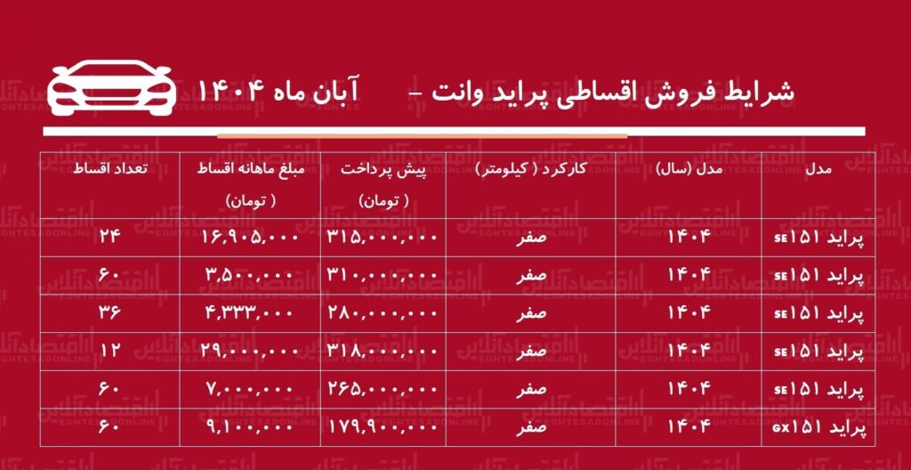 براساس آگهی‌های فروش اقساطی پراید وانت در آبان ماه ۱۴۰۴، پراید ۱۵۱ SE مدل ۱۴۰۴ با پیش‌پرداخت ۳۱۵ میلیون تومان و اقساط ۲۴ ماهه ماهیانه ۱۶ میلیون و ۹۰۰ هزار تومان عرضه می‌شود.