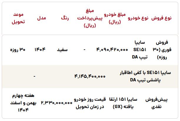 در این طرح، سه تیپ مختلف از وانت سایپا ۱۵۱ عرضه شده است. دو تیپ در قالب فروش فوری و یک تیپ در طرح پیش‌فروش قرار گرفته‌اند. در طرح فروش فوری، قیمت خودروها قطعی است و موعد تحویل آن‌ها ۳۰ روز کاری در نظر گرفته شده است.