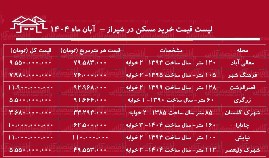 قیمت خرید مسکن در شیراز / جدول آبان ۱۴۰۴