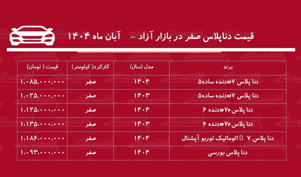 در نهایت، دنا پلاس بورسی نیز امروز با قیمت یک میلیارد و ۹۳ میلیون تومان در بازار آزاد معامله میشود و از ثبات نسبی در روزهای اخیر برخوردار بوده است.