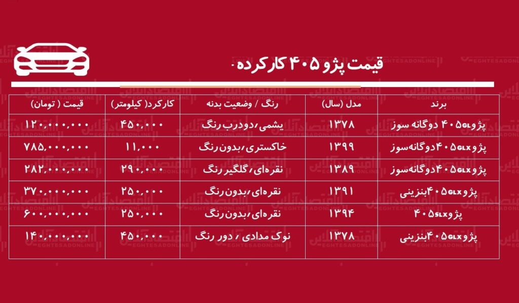 بر اساس آگهیهای پژو ۴۰۵ کارکرده، قیمت پژو ۴۰۵ GL مدل ۱۳۷۸ با کارکرد ۴۵۰ هزار کیلومتر و دو درب رنگ، در بازار خودروهای کارکرده حدود ۱۲۰ میلیون تومان اعلام شده و یکی از ارزانترین گزینههای موجود محسوب میشود.