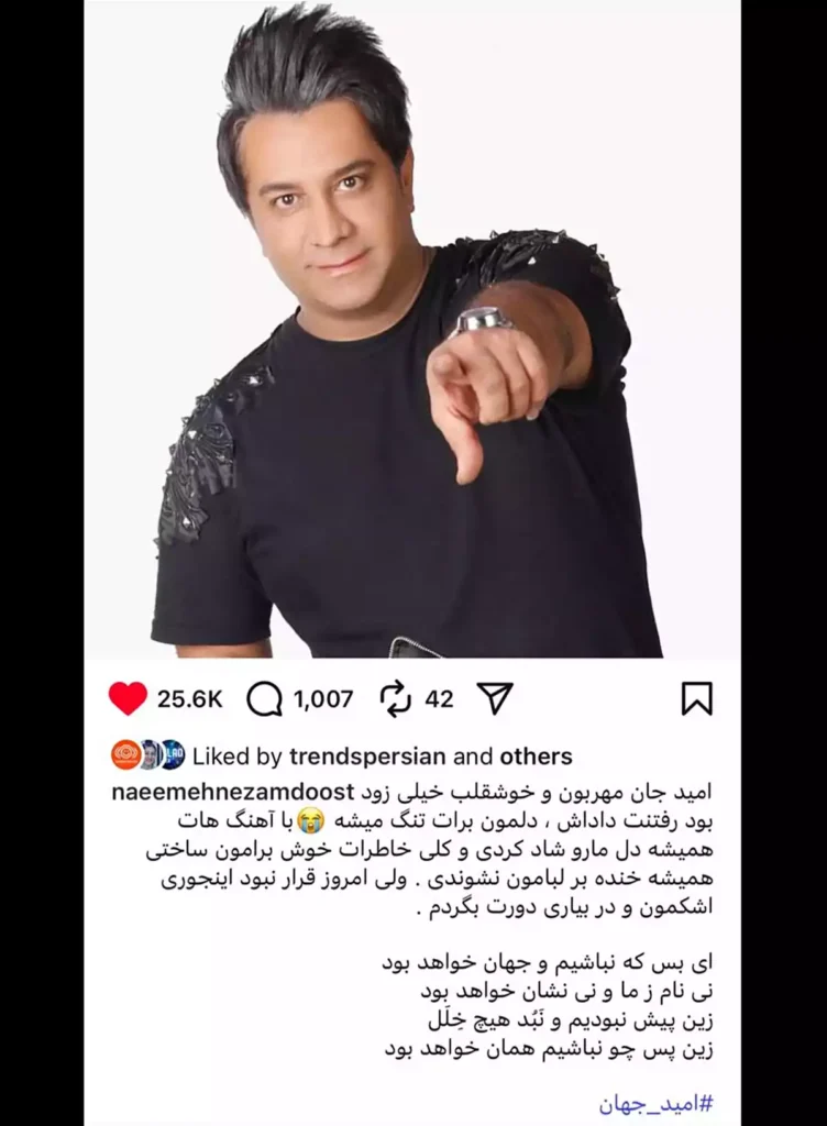 نعیمه نظام دوست یکی از دوستان قدیمی و صمیمی امید جهان بعد از شنیدن خبر فوت این خواننده حسابی ناراحت شده و در اینستاگرامش با ایموجی گریه از این اتفاق ابراز ناراحتی کرد نعیمه نظام دوست در واکنش به مرگ امید جهان در اینستاگرام نوشت: “امید جان مهربون و خوش قلب خیلی زود بود رفتنت داداش دلمون برات تنگ میشه با آهنگات همیشه دل ما رو شاد کردی و کلی خاطرات خوش برامون ساختی همیشه خنده بر لبمون نشوندی ولی امروز قرار نبود اینجوری اشکمونو در بیاری دورت بگردم.”